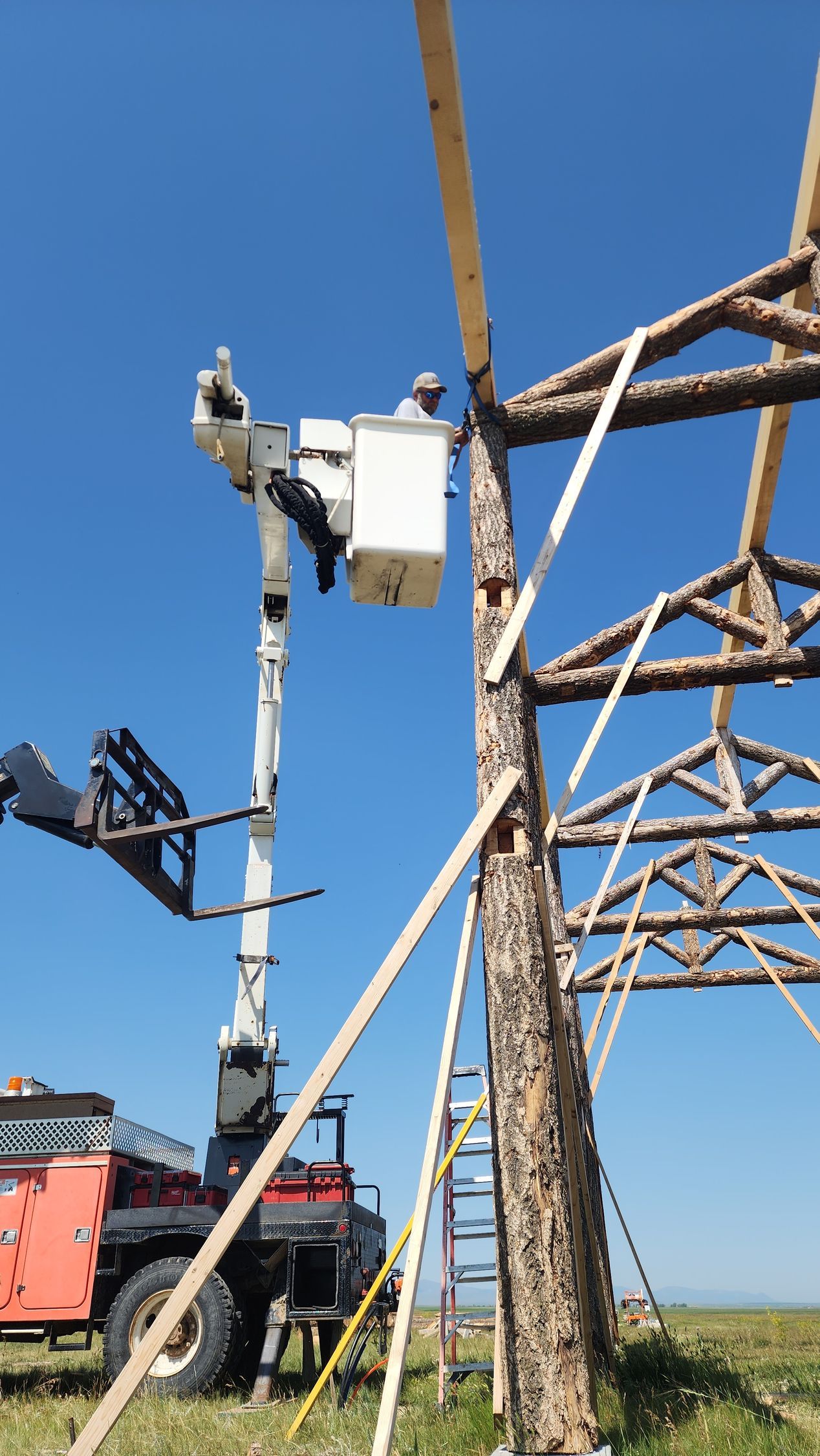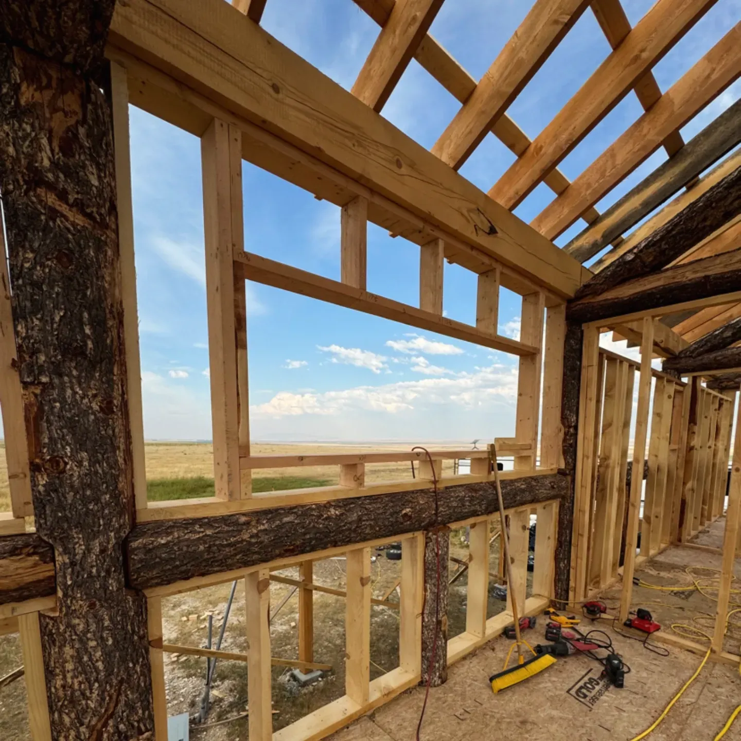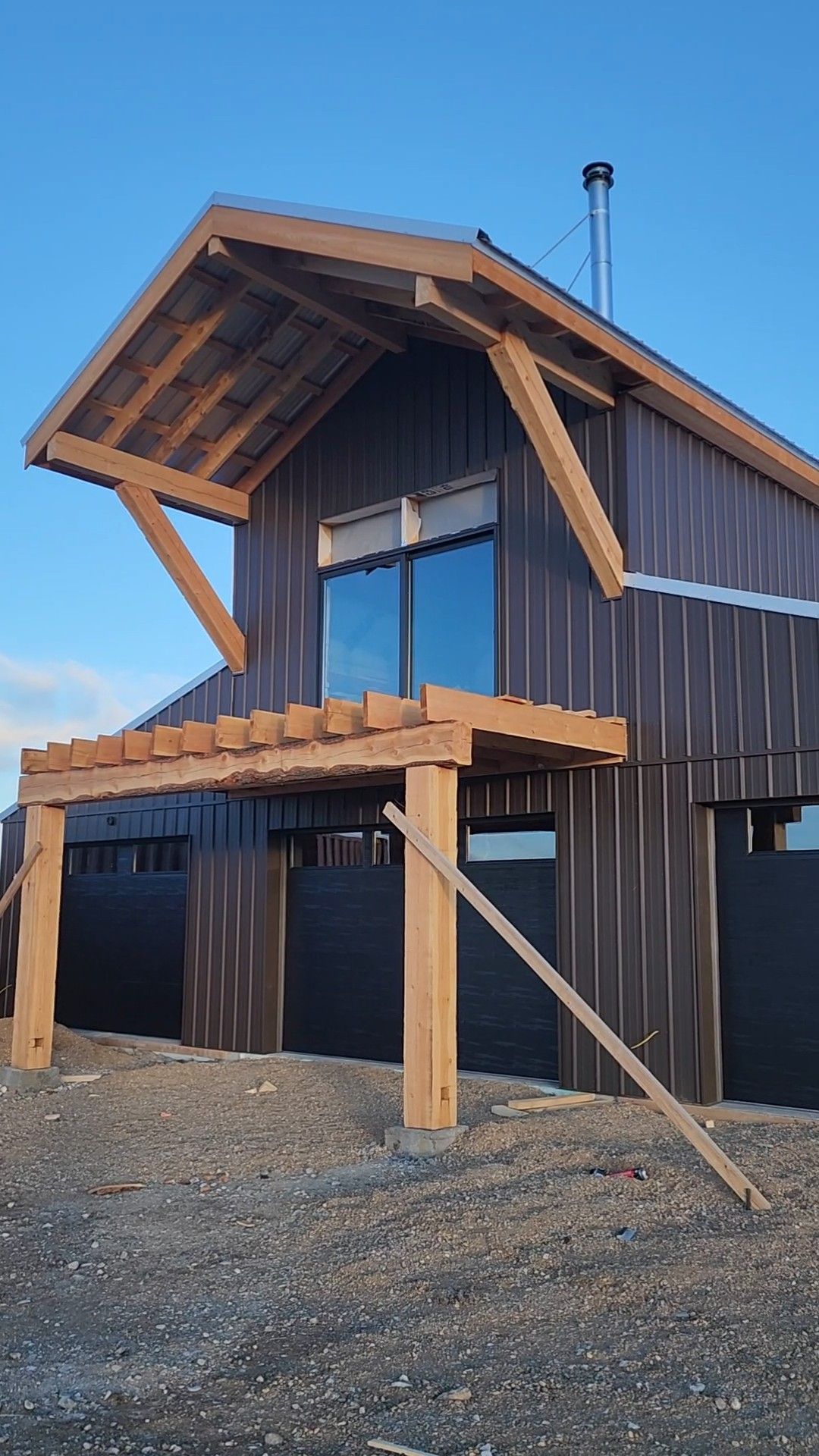 We used large timbers for the dramatic mountain-home effect on this garage topped with an apartment in Hobson, Montana. We created a hybrid of timber-frame structure and barndo appearance.